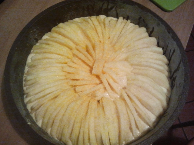 Disporre le fettine di mela sulla torta a raggi formando due cerchi, uno interno e l'altro esterno: